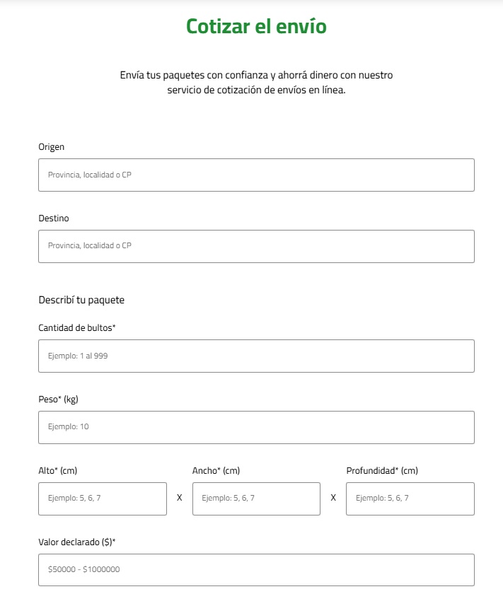 Ingresa los datos solicitados, presiona el botón «Cotizá» y obtendrás un valor aproximado a lo que terminarás pagando por tu envío a DOMICILIO o a SUCURSAL