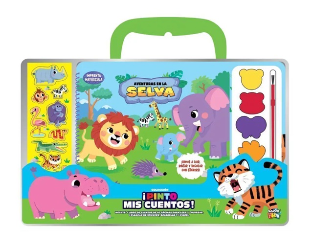 Set de actividades que contiene un libro de cuentos de 40 páginas para leer y colorear, una plancha de stickers, acuarelas y un pincel.