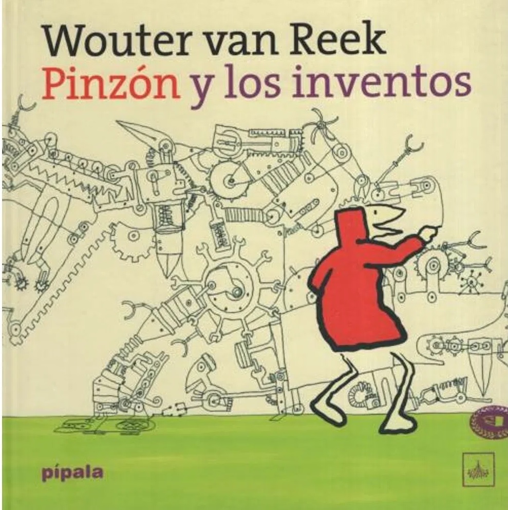 Pinzón se propone diseñar un invento novedoso y práctico: una máquina que alcance las guindas que cuelgan de los árboles más altos que rodean su casa. Su dibujo tiene volante, rueditas, pinzas, botones, cinta transportadora…