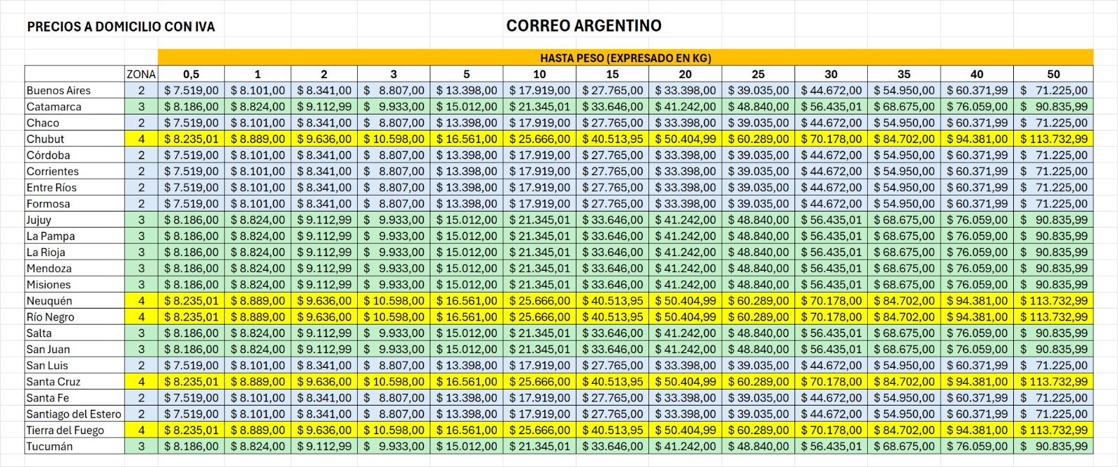 Sólo a modo de referencia adjuntamos el TARIFARIO de Correo Argentino (https://www.correoargentino.com.ar/) desde nuestra sede en Rosario, Santa Fe hasta el destino indicado (*) Buenos Aires incluye Provincia de Buenos Aires y CABA